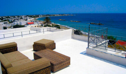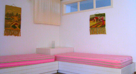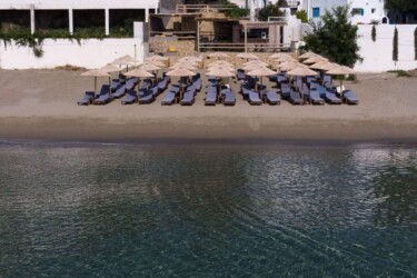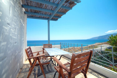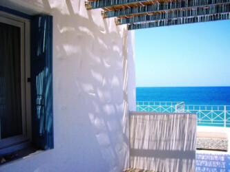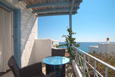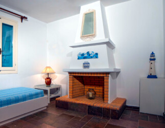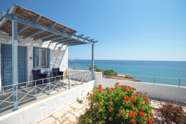 In a garden, blooming with lavender, rosemary, oregano and other aromatic plants, you will find Antigoni’s white and blue studios and apartments, built in total harmony with the blue sea. Their interior combines the color white and the earth’s light shades, simple furniture, detailed with wood and marble from Skyros.The ergonomic mattresses, the sound of the waves and the light breeze that comes in through the windows make sleeping a special experience